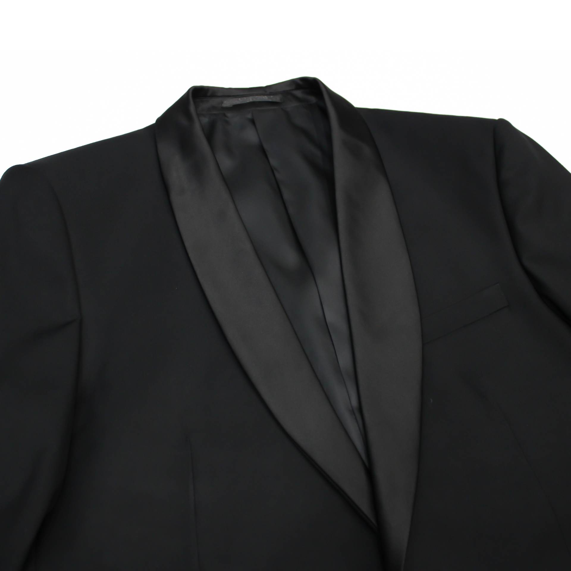 - 2.25-inch black satin shawl lapels